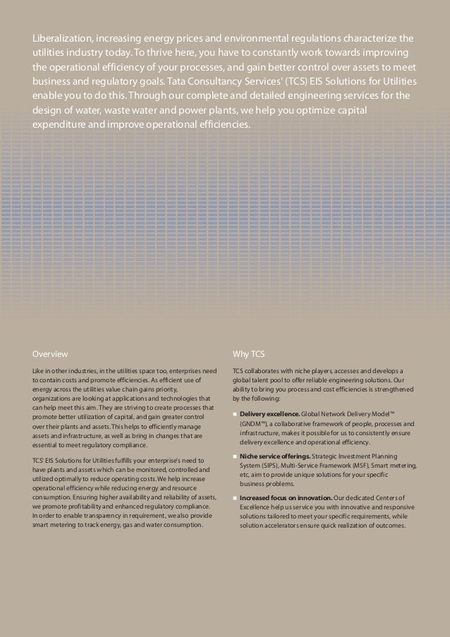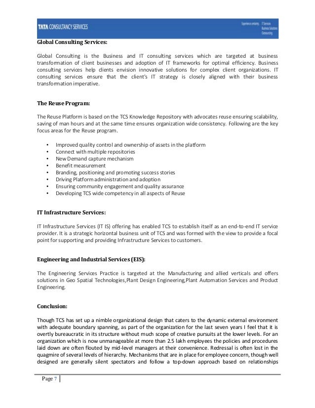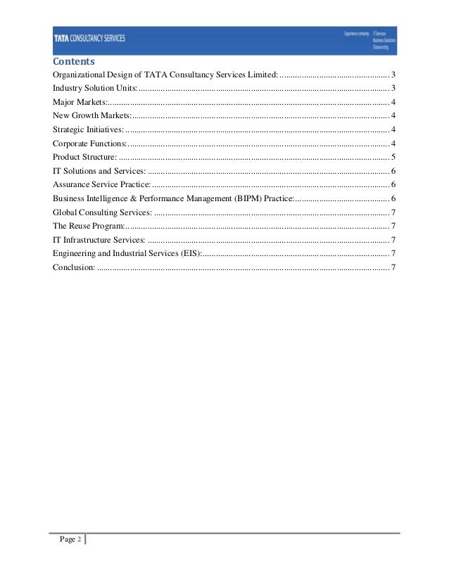 This company also plays the role of a consulting and business solutions firm and operates in about 46 countries. TCS has subdivided all its employees and working arenas mainly into 5 areas at the very starteach section has its head. EIS Business Unit is an integral element of TCS strategy to provide increased value to its customers a.